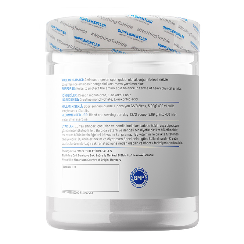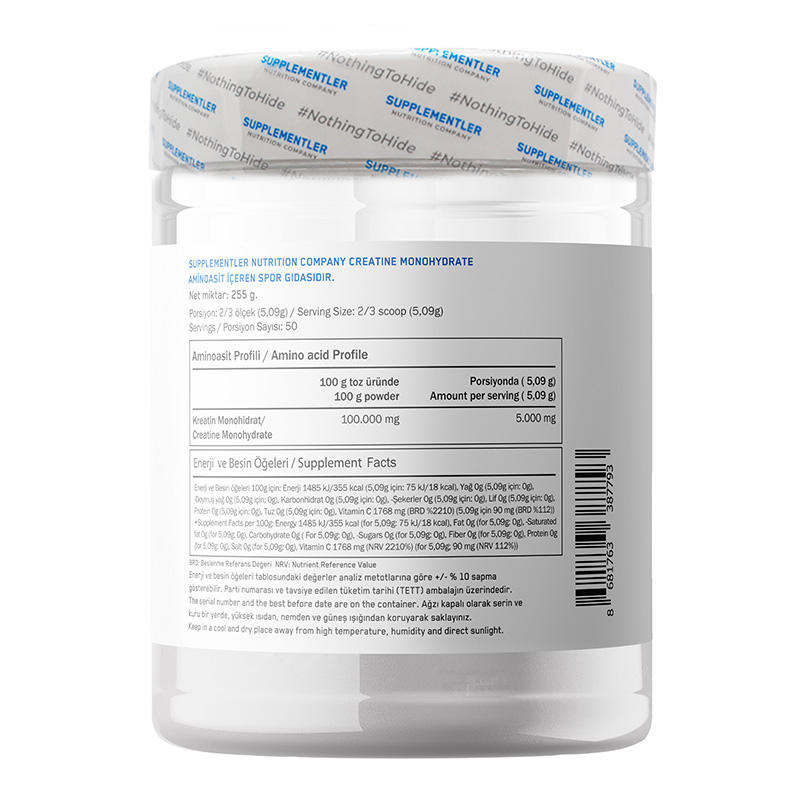 Supplementler.com Micronized Creatine 255 Gr, toz formda sunulan ve 200 mesh mikronize kreatin monohidrat içeren bir sporcu gıdasıdır. Formülünde kreatin monohidrata ek olarak L-askorbik (C vitamini) asit bulunur. Su ile karıştırılarak hazırlanmaya uygun yapısı sayesinde günlük rutine kolayca eklenebilir. Ürün 255 g net miktara sahiptir ve toplam 50 servis sunar.